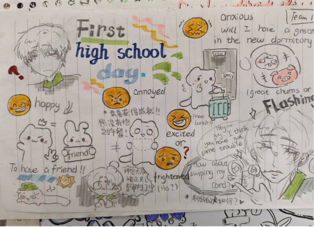 小组作业则成为新生快速破冰的“催化剂”。除了社团海报设计,部分班级还推出了“词汇导图共创”任务——四到五人一组,围绕“校园生活”“兴趣爱好”等主题,将相关词汇梳理成思维导图,有的小组用不同图标的形式标注单词,有的则用颜色区分词性,原本枯燥的词汇学习变成了充满趣味的集体创作。“刚开始和组员不熟,讨论作业时还很拘谨,后来一起查词典、画导图,不知不觉就聊开了。”高一(2)班的一名学生说:“通过合作完成作业,她已经和三位同学成为了好朋友。”