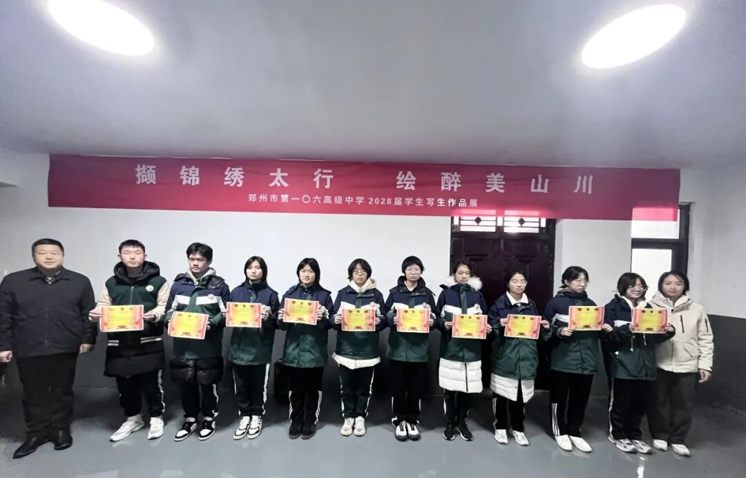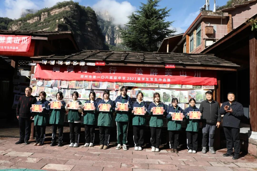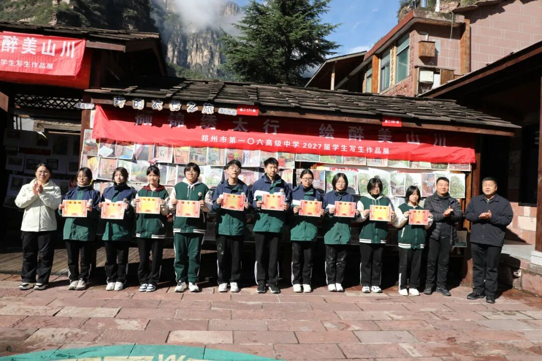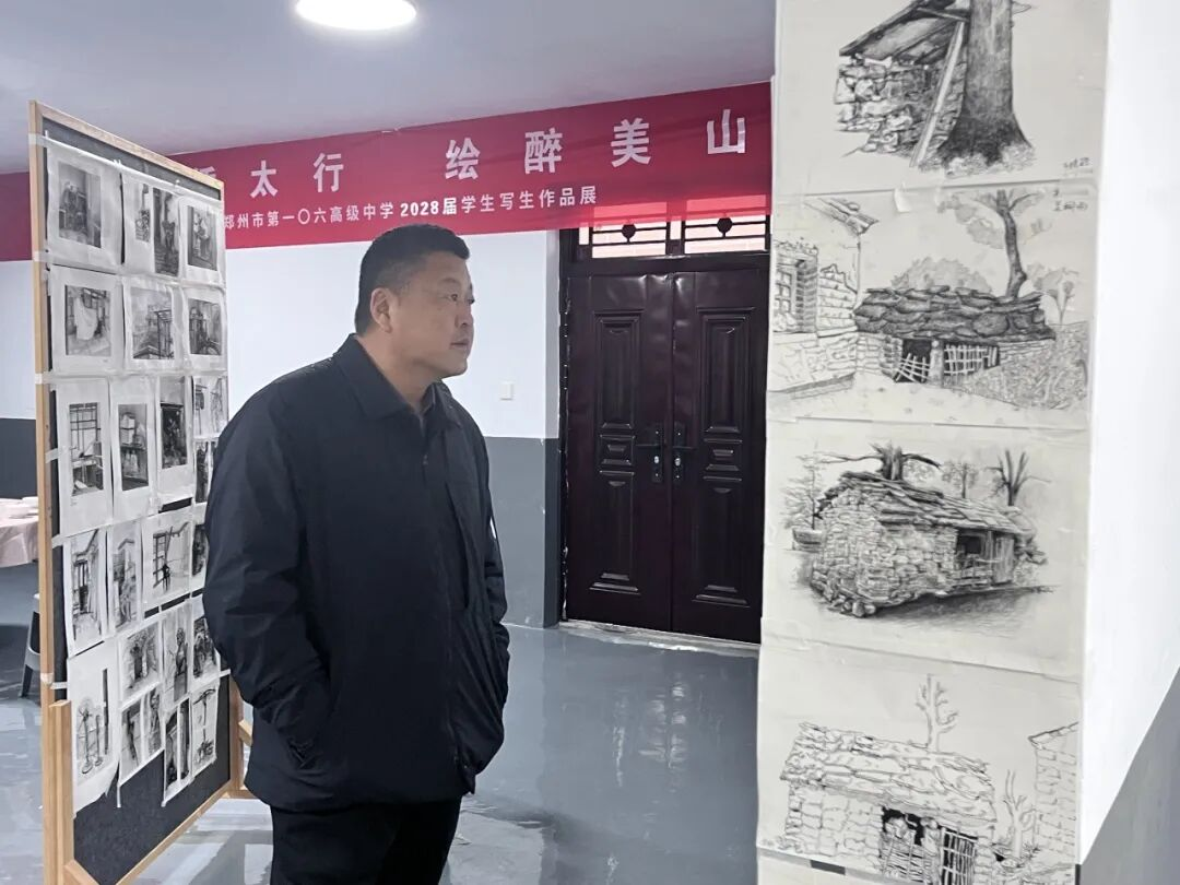 为展示学生优秀画作,促进同学之间学习交流,郑州市第一〇六高级中学高一、高二年级在石板岩举办了写生优秀作品展。校党委书记李明德参加了以“撷锦绣太行,绘醉美山川”为主题的学生画展并为获奖学生颁发奖项。