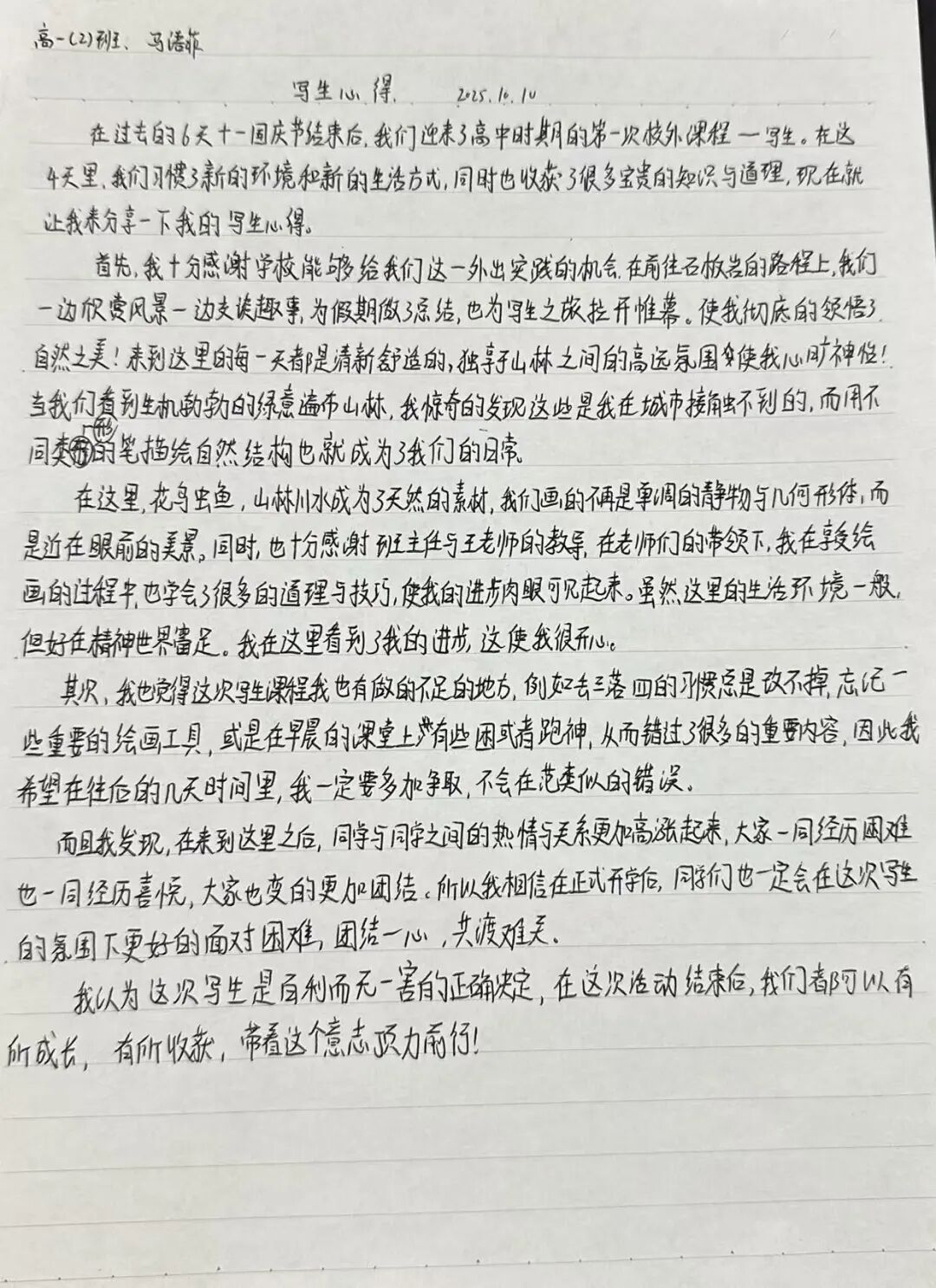 班主任老师始终悉心照料,从清晨的早读陪伴,到夜晚的查寝关怀,将学生的生活与学习挂在心上。坚持每日批改学生心得,精准把握每个人的心理动态,用时刻的陪伴给予学生安心。正是师生同心、共同努力,才织就了这片安全、专业又满含温暖的写生天地。