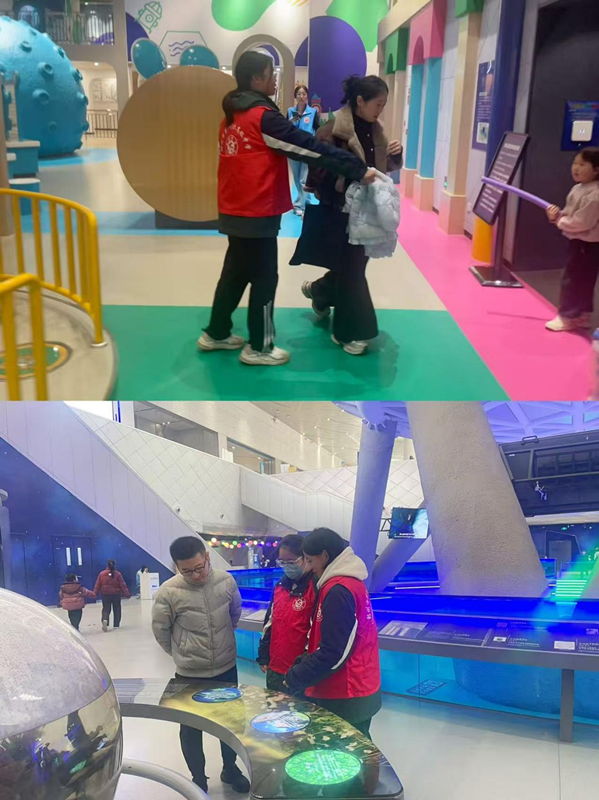 服务过程中,志愿者们主动上前提供帮助:帮小朋友操作互动设备,为有需要的游客指引路线,解答与展项相关的疑问,在游客身体不适时及时伸出援手。他们细致周到的服务,赢得了现场游客的一致好评。活动结束后,全体参与师生在科技馆内合影留念,定格此次 “科技 + 志愿” 的实践瞬间。