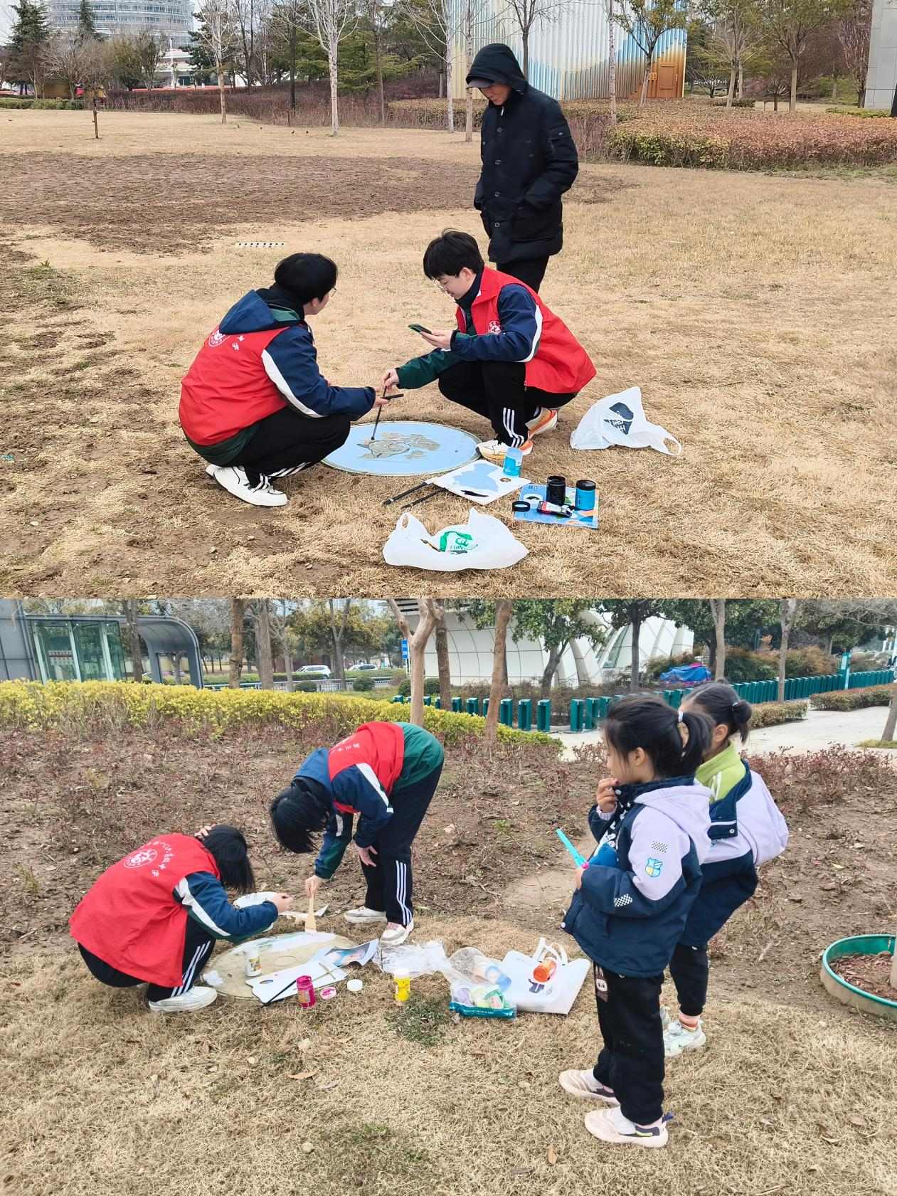 绘画创作组的志愿者充分发挥美术专业优势,在公园井盖上进行创意涂鸦创作。活动前,他们提前构思、绘制草图,做好充分准备;活动现场,大家手持画笔,凝心聚力、精心描绘。创作中,志愿者们相互配合、分工协作,反复打磨细节、优化色彩搭配,力求每幅作品兼具美感与内涵。活动期间,不少市民驻足观看、交口称赞,也有效激发了现场小朋友对绘画艺术的兴趣与热爱。嫩绿的新芽、娇艳的花朵、可爱的卡通形象、秀丽的山水风景……原本单调朴素的井盖,在志愿者们的妙笔之下,蜕变为一个个生动有趣、充满生机的“春日景观”。