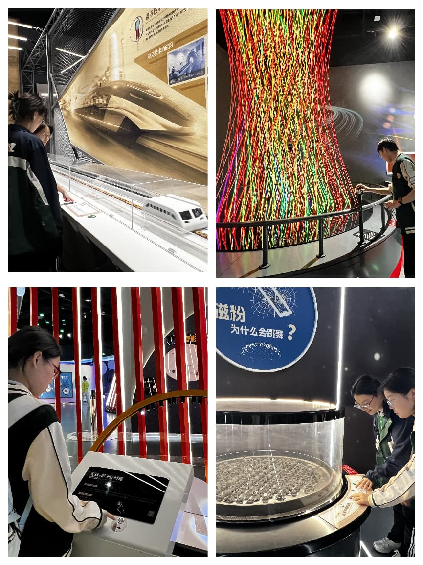 物理展区涵盖了声学、电磁学和光学等多个领域。同学们通过吉他装置、无弦激光竖琴、声画互动等设备,直观认识声音的产生与传播规律。在电磁区,大家体验蹬车发电项目,观察磁场、磁悬浮等展示,进一步理解电磁感应原理及其应用。光学展区借助光的反射、折射以及双缝干涉实验装置,让同学们观察光的传播与干涉现象,理解光的波动性,对光线传播、成像原理等内容有了更加具体的认知。