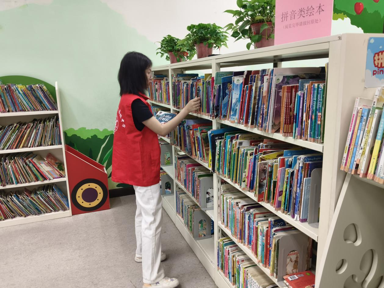 志愿者认真整理书架
