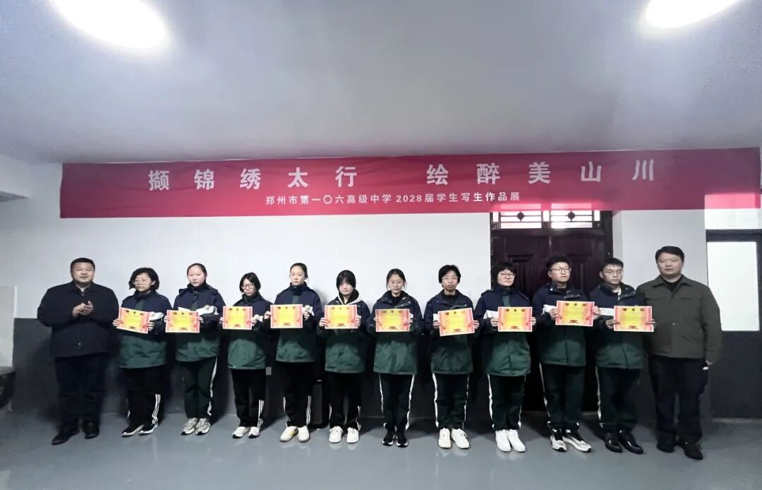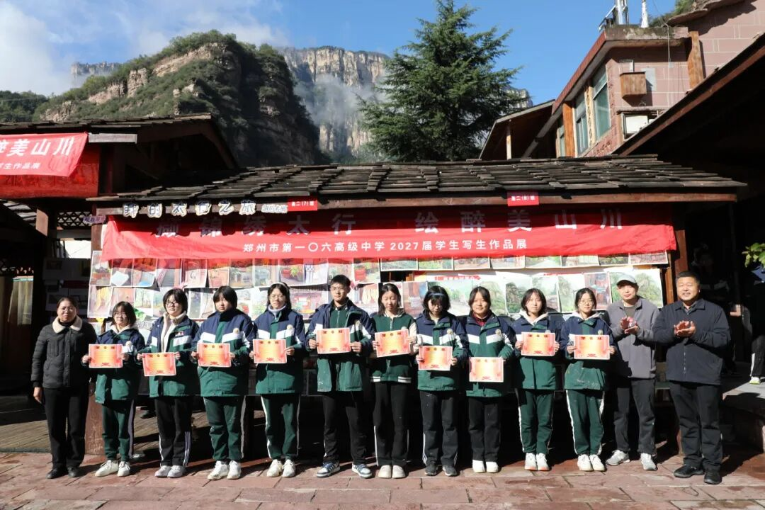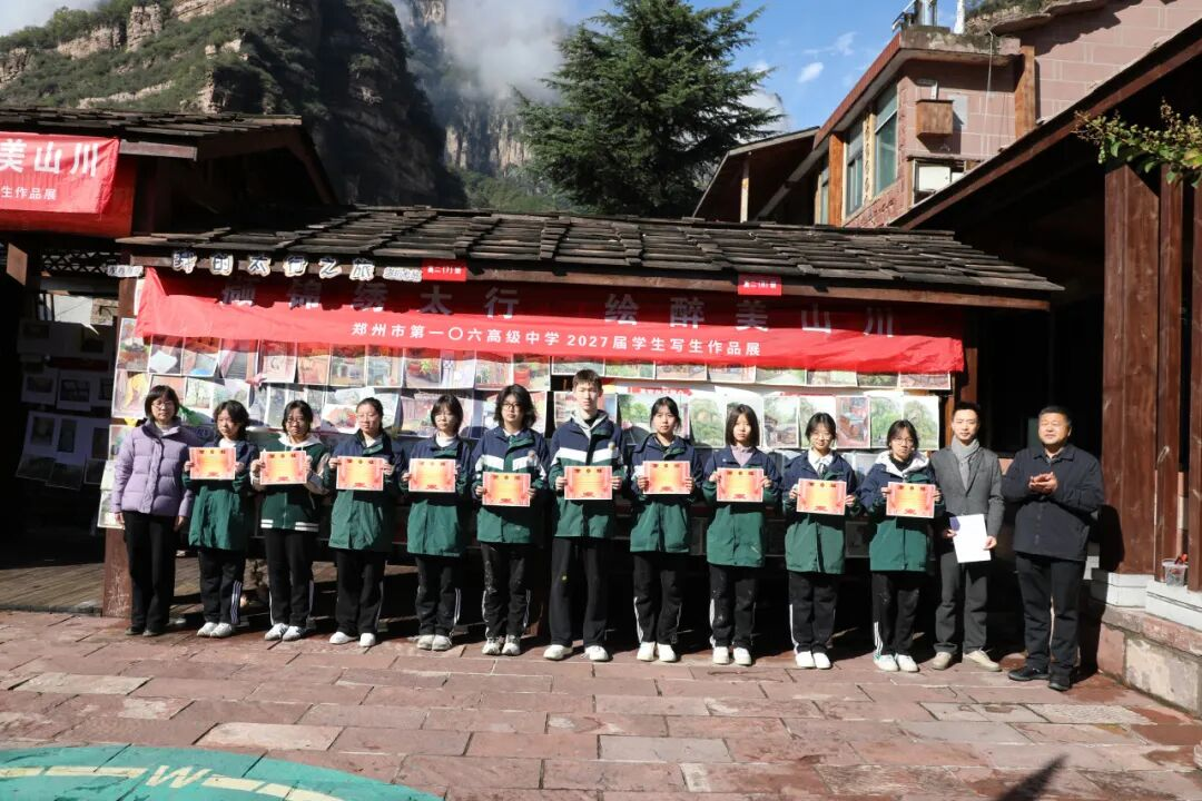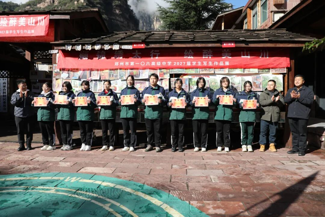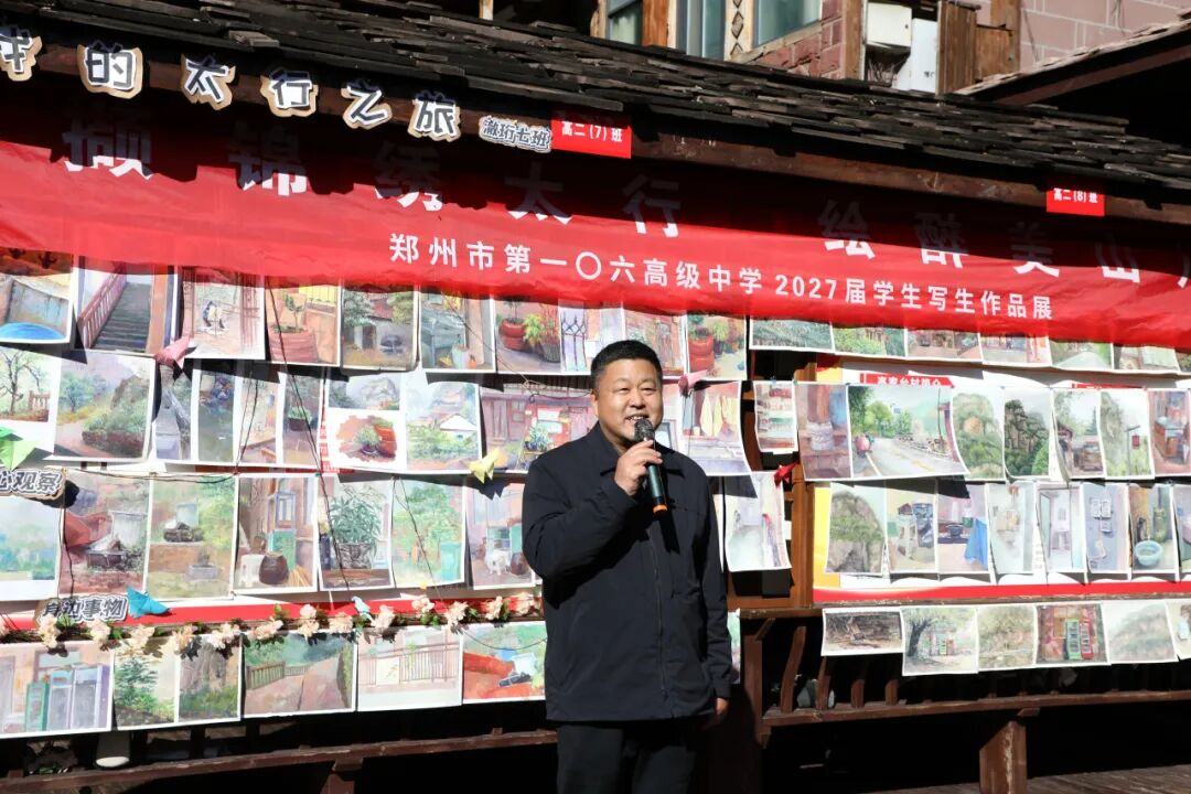 为展示学生优秀画作,促进同学之间学习交流,郑州市第一〇六高级中学高一、高二年级在石板岩举办了写生优秀作品展。校党委书记李明德参加了以“撷锦绣太行,绘醉美山川”为主题的学生画展并为获奖学生颁发奖项。