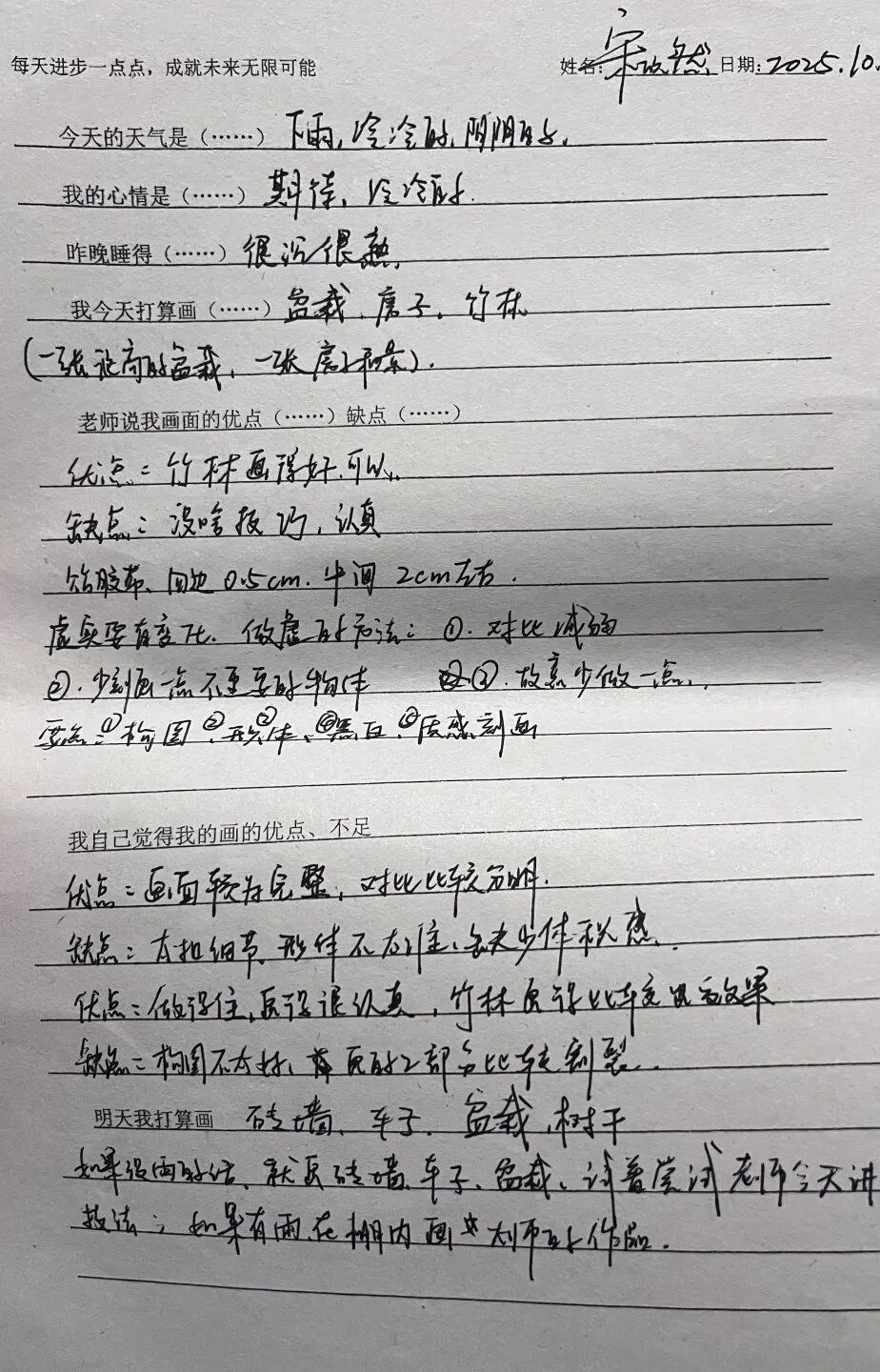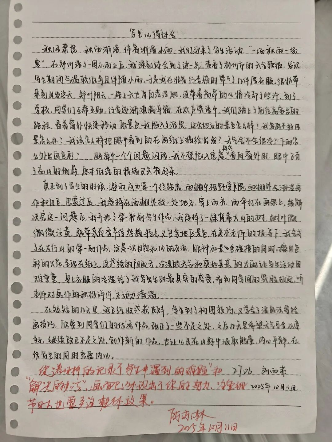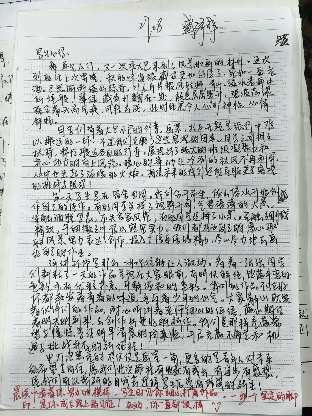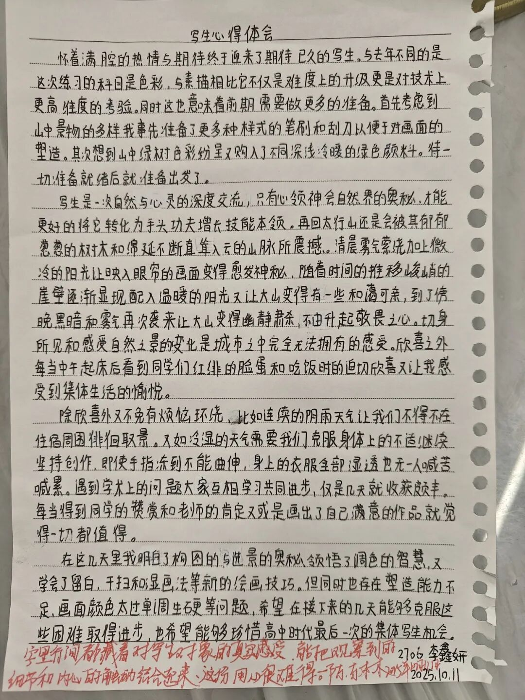 班主任老师始终悉心照料,从清晨的早读陪伴,到夜晚的查寝关怀,将学生的生活与学习挂在心上。坚持每日批改学生心得,精准把握每个人的心理动态,用时刻的陪伴给予学生安心。正是师生同心、共同努力,才织就了这片安全、专业又满含温暖的写生天地。