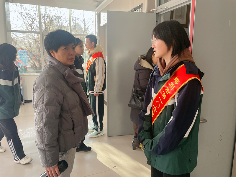 12月14日下午,郑州市第一〇六高级中学的校园内处处洋溢着温馨氛围。各个班级都做了充分准备:干净整洁的教室、精心布置的展墙、绘有温馨图案的黑板报,还有班主任精心制作的学生成长档案,无一不向家长们展示着学校良好的班级风貌。校园志愿者提前接受培训后前往指定位置等候引导家长,下午3时许,家长们按规定时间陆续入校,在志愿者的引导下有序进入会场。这些身披红色绶带的学生志愿者,为校园增添了一道亮丽的风景。