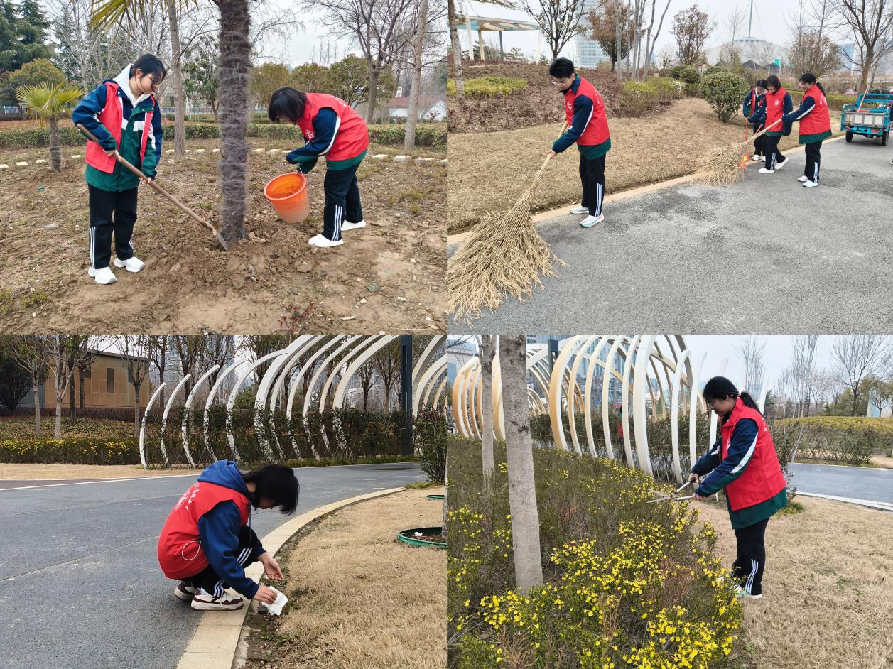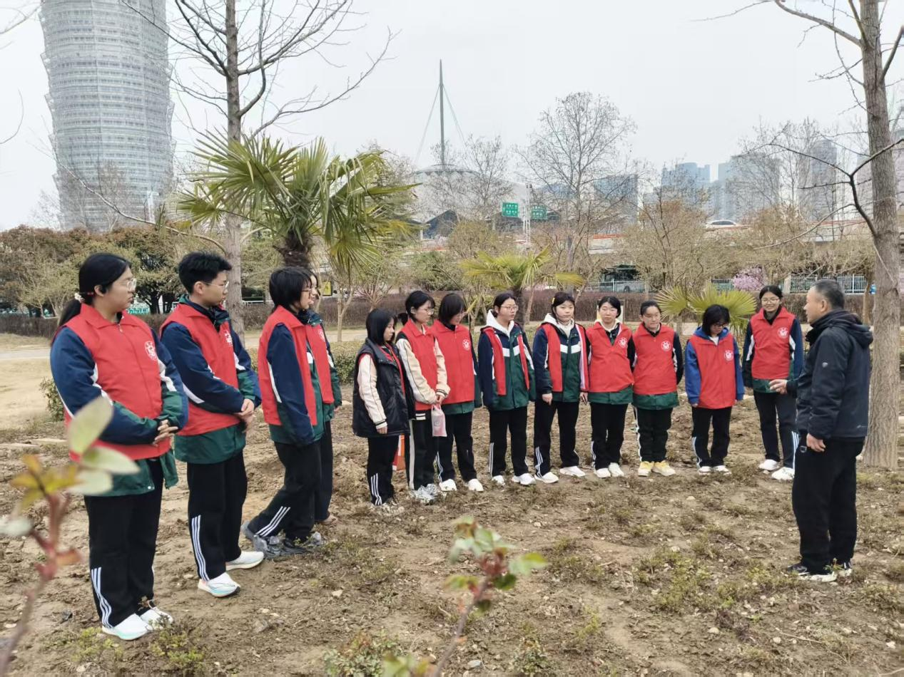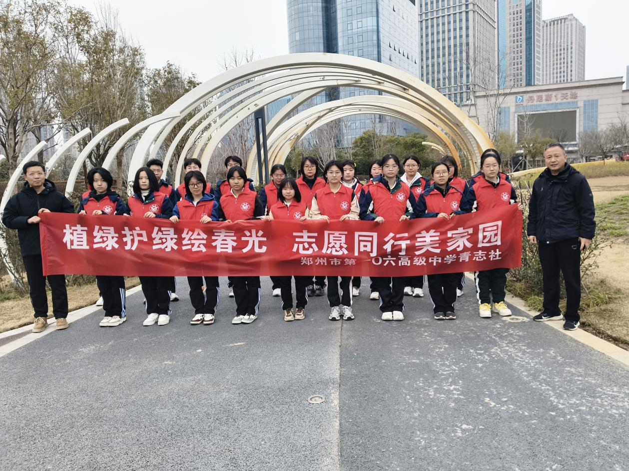 草长莺飞三月天,志愿劳动正当时。为深化劳动教育、践行志愿服务精神、落实绿色环保理念、延续植树节护绿初心,3月15日下午,郑州市第一〇六高级中学青年志愿者社团的20名志愿者,在指导教师郭雨健的带领下走进郑东新区晴芳园,开展“植绿护绿绘春光 志愿同行美家园”主题志愿活动。志愿者们分为环境保护组与绘画创作组,以劳动护绿与创意绘绿的双重方式为城市公园增添春日色彩,用实际行动诠释志愿精神。