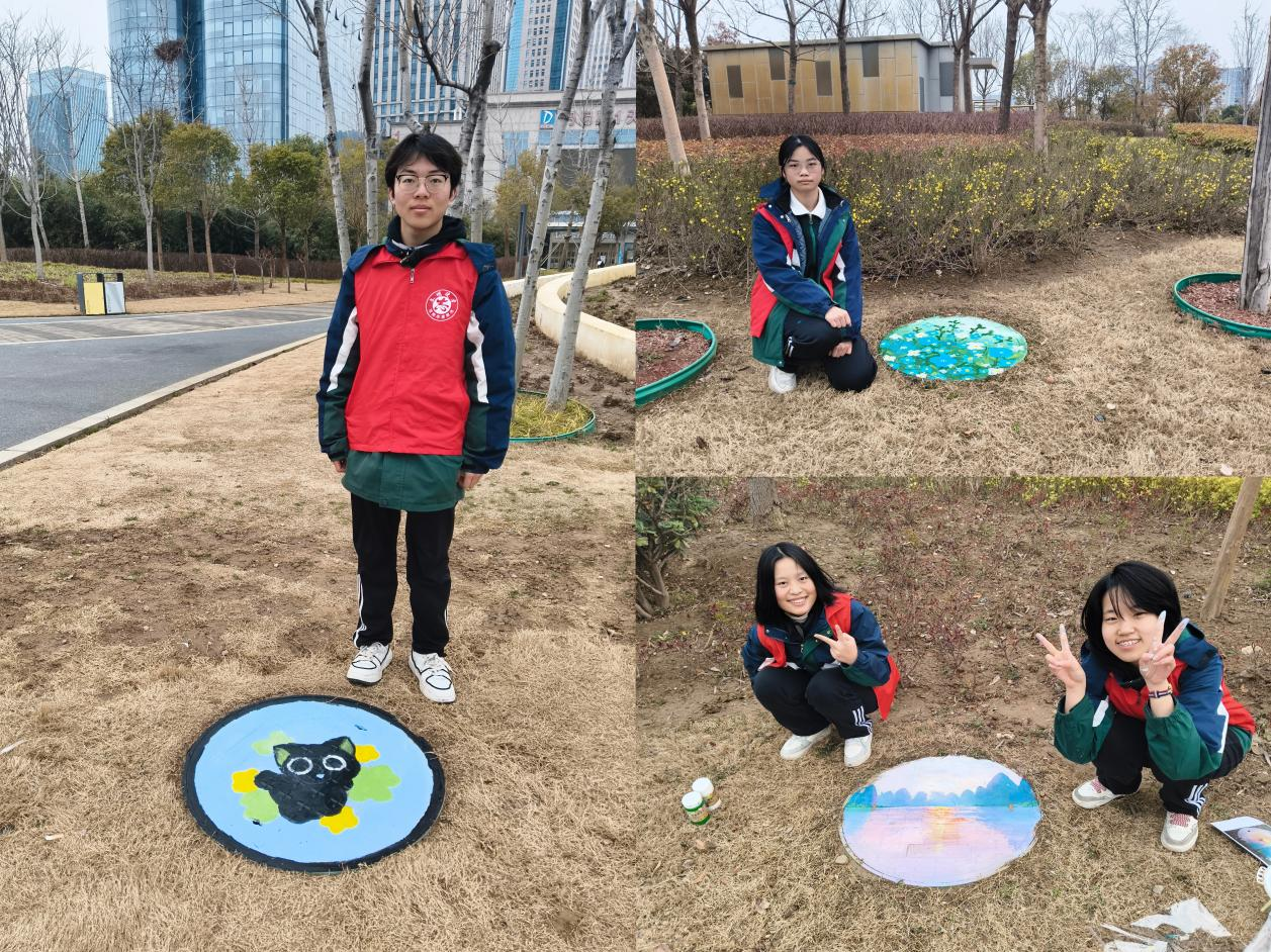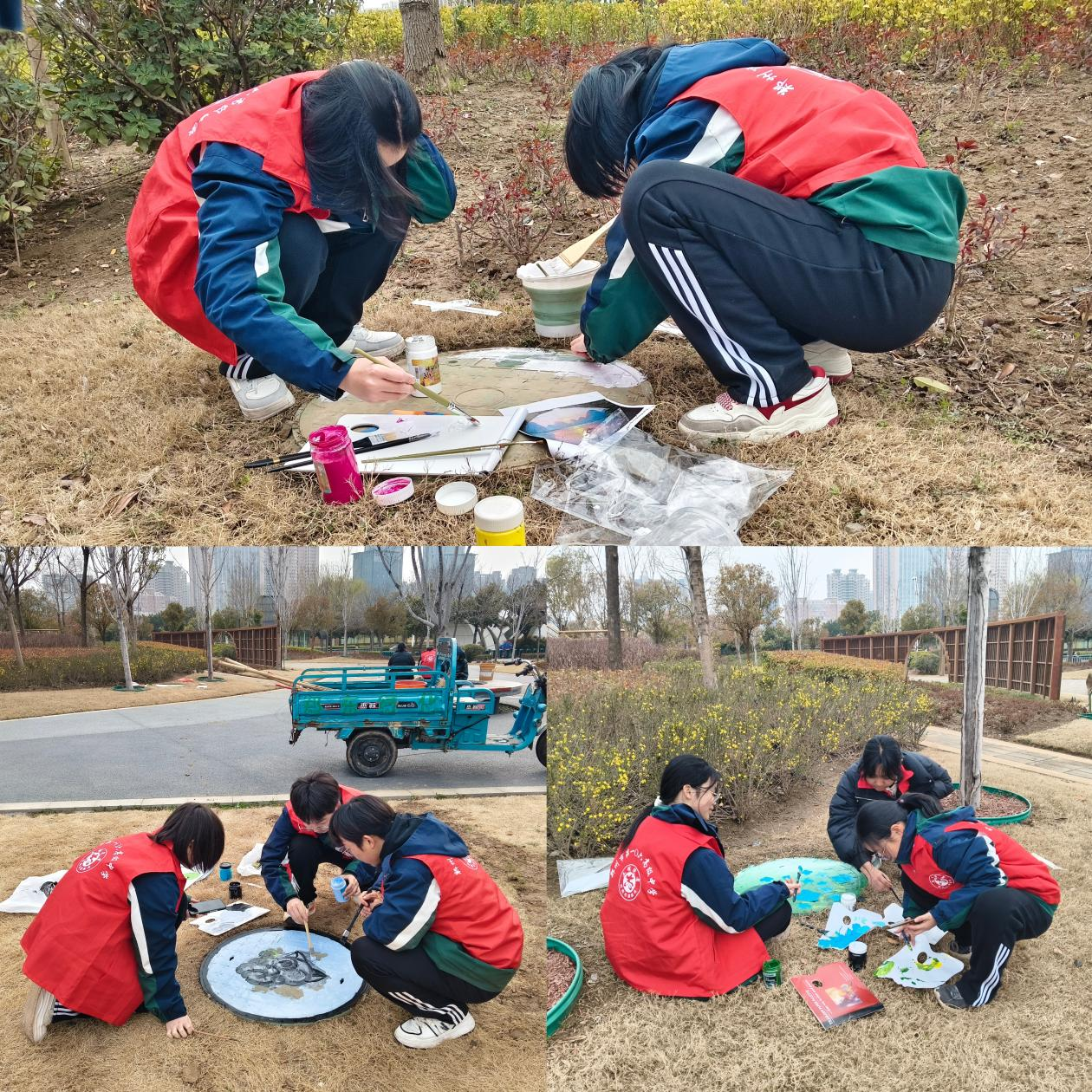绘画创作组的志愿者充分发挥美术专业优势,在公园井盖上进行创意涂鸦创作。活动前,他们提前构思、绘制草图,做好充分准备;活动现场,大家手持画笔,凝心聚力、精心描绘。创作中,志愿者们相互配合、分工协作,反复打磨细节、优化色彩搭配,力求每幅作品兼具美感与内涵。活动期间,不少市民驻足观看、交口称赞,也有效激发了现场小朋友对绘画艺术的兴趣与热爱。嫩绿的新芽、娇艳的花朵、可爱的卡通形象、秀丽的山水风景……原本单调朴素的井盖,在志愿者们的妙笔之下,蜕变为一个个生动有趣、充满生机的“春日景观”。