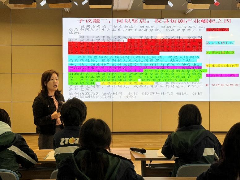 尹晓洁老师的《经济与社会》高三复习课,紧扣二轮备考核心目标,打造出靶向性极强的实效课堂。课堂以郑州本土短剧产业为鲜活素材,采用一案到底模式,用递进式子议题串联全程。授课中,尹老师紧扣高考考情设计原创仿真题,通过连续提问、追问,引导学生多角度剖析产业现状、深挖发展动因、解析经济赋能路径。她同步整合学科核心知识点,提炼实用解题技巧,针对单招返校学生知识生疏、答题口语化的问题现场矫正,手把手传授规范答题逻辑。整堂课实现情景、教材与高考考向无缝衔接,学生在沉浸式探究中搭建知识体系,尽显高三复习课的高效与深度。