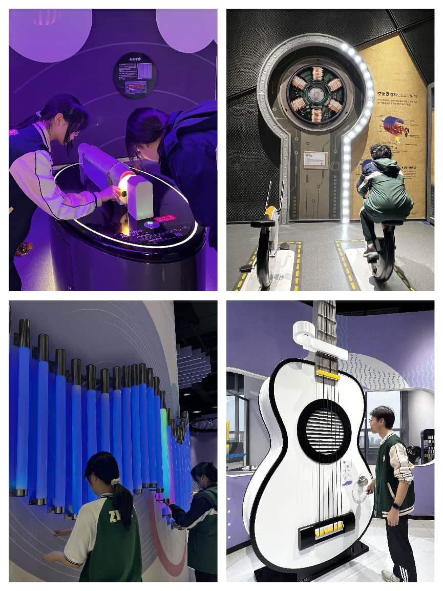 物理展区涵盖了声学、电磁学和光学等多个领域。同学们通过吉他装置、无弦激光竖琴、声画互动等设备,直观认识声音的产生与传播规律。在电磁区,大家体验蹬车发电项目,观察磁场、磁悬浮等展示,进一步理解电磁感应原理及其应用。光学展区借助光的反射、折射以及双缝干涉实验装置,让同学们观察光的传播与干涉现象,理解光的波动性,对光线传播、成像原理等内容有了更加具体的认知。