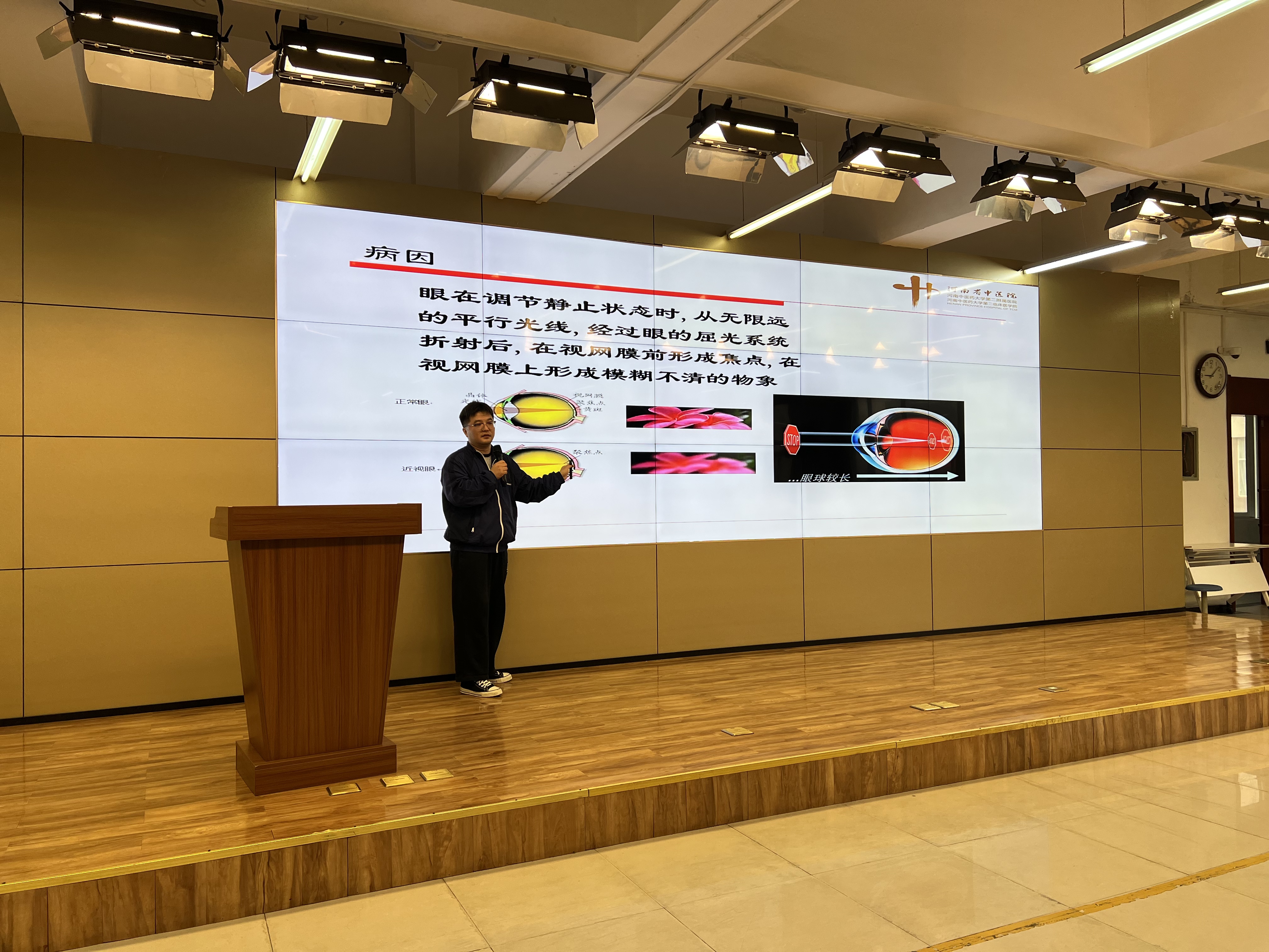 讲座伊始,孙明星医师结合我国儿童青少年近视防控严峻形势,用详实数据直观呈现小学生、初中生、高中生近视率逐年攀升的现状,点明高度近视带来的健康风险,强调近视防控刻不容缓。他从眼球解剖结构、近视成因、近视分级等基础知识讲起,用通俗易懂的语言拆解遗传与环境两大影响因素,明确合理采光、端正坐姿、控制用眼时长、减少甜食摄入等可控护眼要点。
